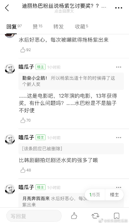 Ngay khi tin này được đăng tải thì mới đây, fandom hai nhà Địch Lệ Nhiệt Ba và Dương Tử xảy ra tranh chấp vì giải thưởng này. Nếu như fan nhà Địch Lệ Nhiệt Ba nói fan Dương Tử ăn mày muốn được giải thưởng này, thì fan nhà Dương Tử phản kích nói rằng vào năm 2012, thần tượng họ đã đạt được giải thưởng này rồi. Đồng thời, phía fan Dương Tử mỉa mai cho rằng Địch Lệ Nhiệt Ba là thủy hậu (nhận giải nhờ vào thủy quân: mua giải, bỏ tiền ra thuê người tâng bốc).