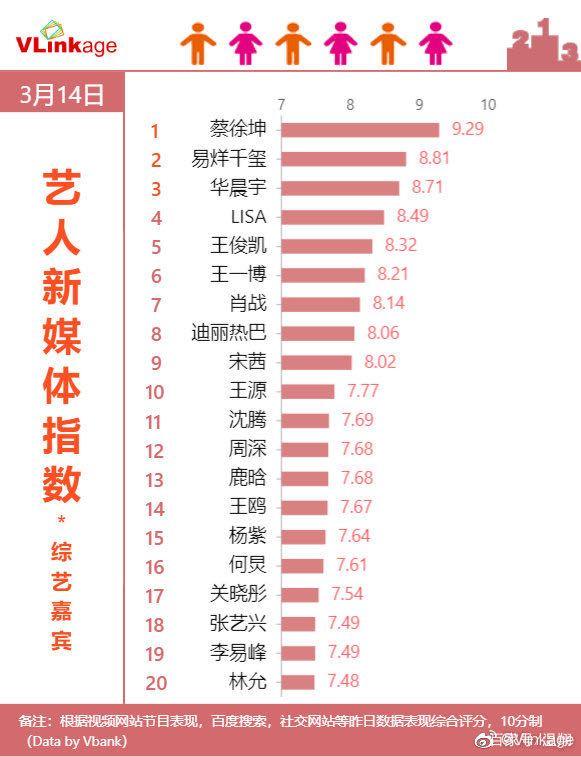 Thái Từ Khôn đứng đầu trong BXH chỉ số truyền thông của nghệ sĩ vào ngày 14/03, Tiêu Chiến ra khỏi top 5.