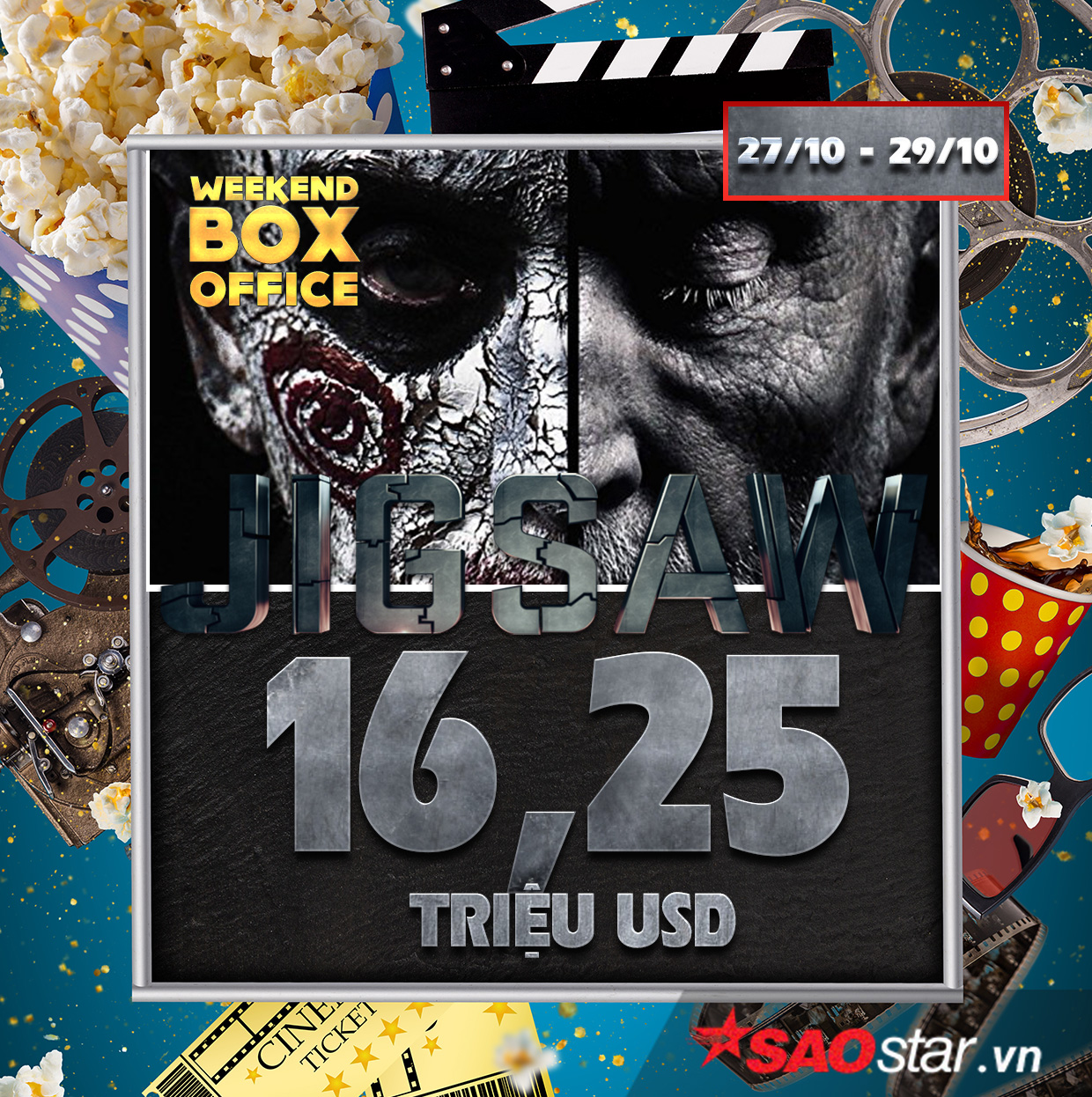 Phim kinh dị đáng mong đợi nhất mùa Halloween năm nay - Jigsaw - đã chính thức đổ bộ phòng vé Bắc Mỹ vào tối thứ Năm 26/10. Sau 7 năm, hãng Lionsgate đang mang series Saw trở lại màn ảnh rộng với doanh thu khá khả quan: 16,25 triệu USD trong 3 ngày đầu tiên vào cuối tuần vừa qua (từ 27-29/10). Tuy nhiên, Jigsaw 2017 chỉ đứng thứ 7 trong tổng số 8 phim của series Saw, cao hơn phần 6 vào năm 2009 mà thôi. Còn nhớ, phần Saw đầu tiên mà James Wan giới thiệu đến toàn thế giới đã thu về 18,2 triệu USD nội địa và 103 triệu USD toàn cầu.