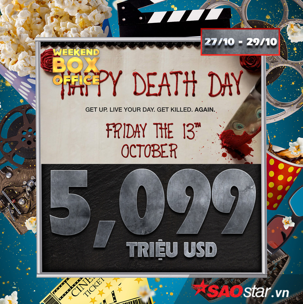 Happy Death Day (Sinh nhật chết chóc) của Universal và Blumhouse vẫn còn ở vị trí thứ 4. Trong 3 ngày cuối tuần vừa qua, phim kinh dị về cái chết trong ngày sinh nhật đã thu được 5 triệu USD tại Bắc Mỹ, hiện nắm giữ 48,3 triệu USD doanh thu nội địa và bước sang tuần thứ 3 công chiếu.