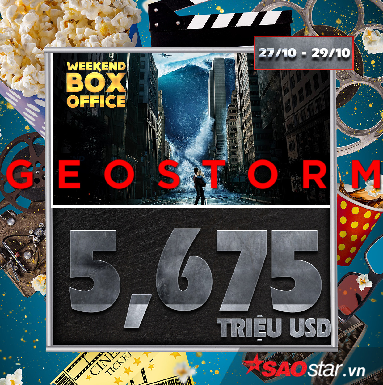Geostorm (Siêu bão địa cầu) của hãng Warner Bros. hạ cánh ở vị trí thứ 3 với 5,67 triệu USD, tức đã có 23,5 triệu USD sau 10 ngày công chiếu. Tuy nhiên, bộ phim về thảm họa địa cầu này lại ra mắt thành công ở nước ngoài, tại Trung Quốc, Geostorm đã mở màn với 34,1 triệu USD, nâng tổng số doanh thu quốc tế của phim lên 113,4 triệu USD.