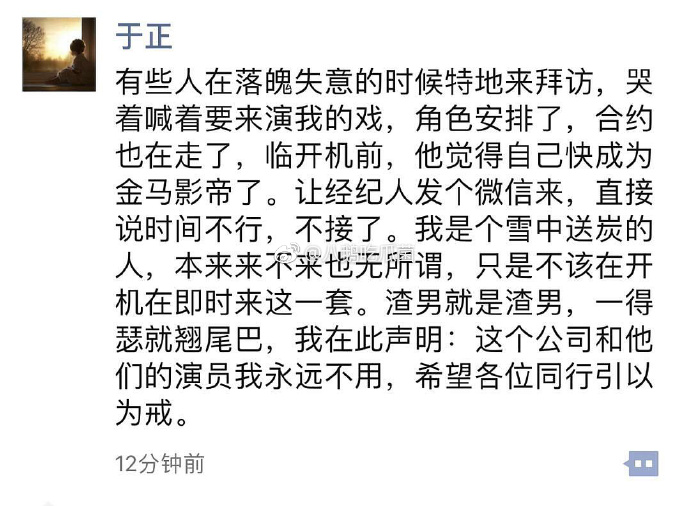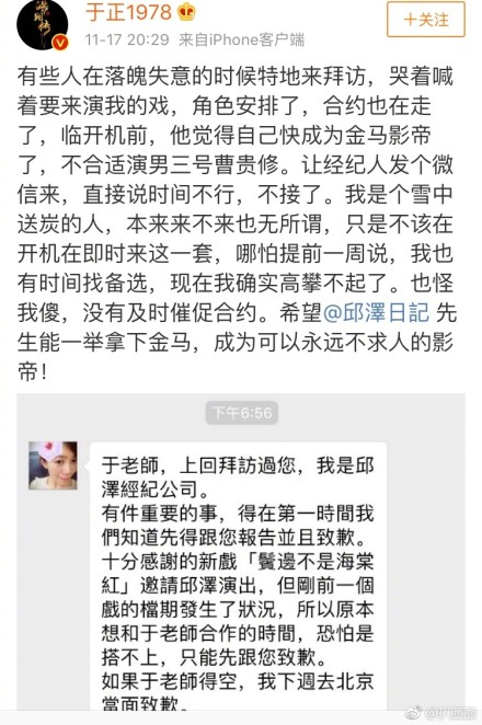 Tôi là người đưa than sưởi ấm trong ngày tuyết rơi, vốn dĩ đến hay không quan trọng, nhưng cũng đừng để đến sát ngày khai máy mới nói. Nói trước một tuần tôi mới có thời gian chuẩn bị tìm người thế. Bây giờ tôi thật sự trèo cao quá rồi. Cũng trách tại tôi ngốc, không nhanh chóng ký hợp đồng. Hy vọng @Khưu Trạch tiên sinh có thể giành được Kim Mã, trở thành một Ảnh đế mãi mãi không cần cầu xin người khác!”.