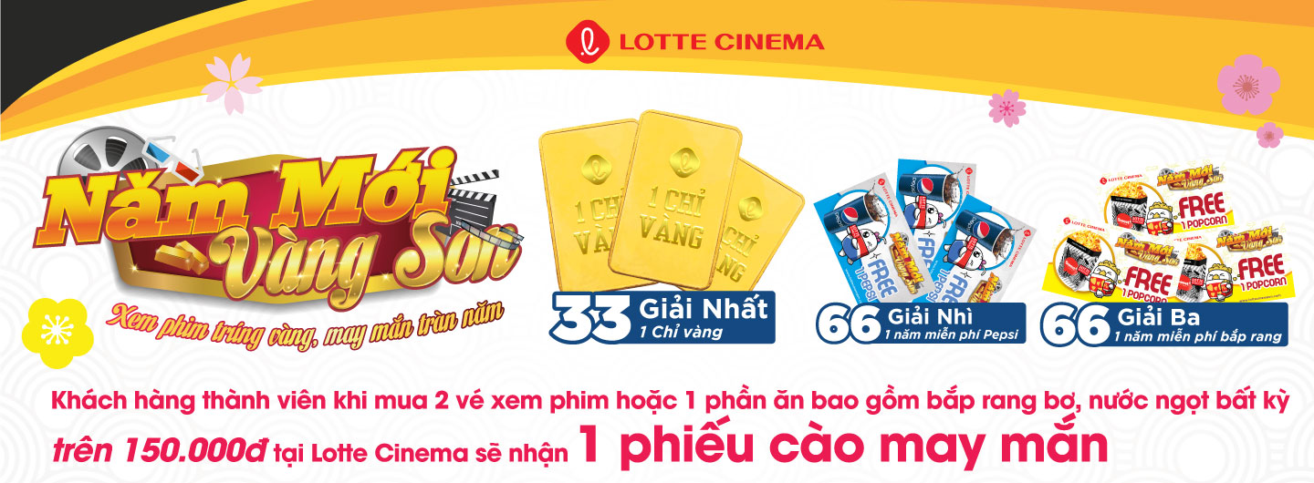Xem phim đón Tết, nhớ ghé rạp Lotte Cinema. Thành viên của rạp mua từ 2 vé xem phim được nhận thẻ cào trúng ngay với nhiều chỉ vàng 24k cho mùa Tết may mắn và “ấm no”, cùng các phần quà bắp và nước miễn phí, cho trải nghiệm điện ảnh thêm hoàn hảo và tuyệt vời. Để làm thẻ thành viên, chỉ cần có CMND, tới quầy vé làm tại chỗ trong 3 phút lấy ngay và hoàn toàn miễn phí. Thông tin chi tiết chương trình xem tại đây.
