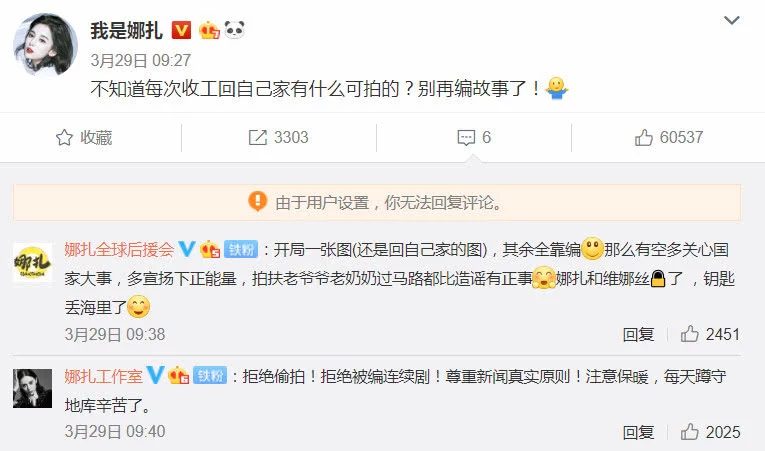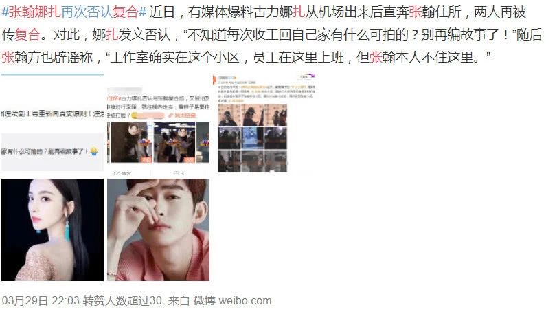 Cổ Lực Na Trát đăng Weibo bày tỏ thái độ: “Không biết mỗi lần kết thúc công việc về nhà mình thì có gì để chụp? Đừng có xào lại chuyện xưa nữa!”. Nhân viên phòng công tác của nữ diễn viên trả lời với phóng viên: “Tuyệt đối không có“, còn phía Trương Hàn cũng đáp lại rằng: “Cái này là tin đồn thất thiệt, cảm ơn mọi người đã quan tâm”.