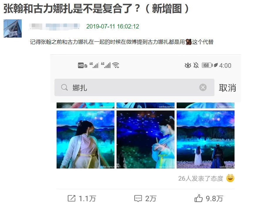 Một số dân mạng suy đoán, lẽ nào Trương Hàn và Cổ Lực Na Trát đã tái hợp? Năm 2015 với bài đăng công khai tình yêu, Trương Hàn dùng icon “Chuột yêu Khỉ” để tượng trưng cho tình yêu giữa mình và Cổ Lực Na Trát. Từ đó về sau, nam diễn viên luôn dùng ký hiệu khỉ con để gọi về cô người yêu mỹ nhân Tân Cương.