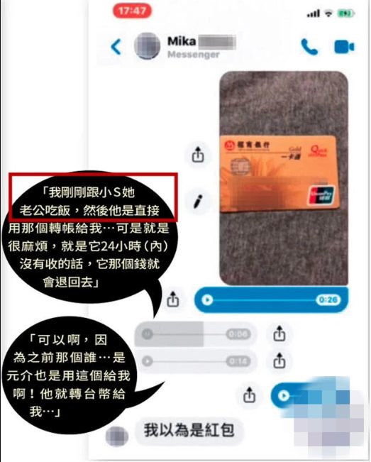 Mika - một người tham gia giao dịch tung tin, chồng của Tiểu S từng thông qua tài khoản Alipay để chuyển cho cô 10.000 NDT. Mika rất cám ơn Hứa Nhã Quân, thậm chí cô này từng nói với người trung gian rằng: “Không biết ông ấy có thể chăm sóc tôi đến bao giờ?”