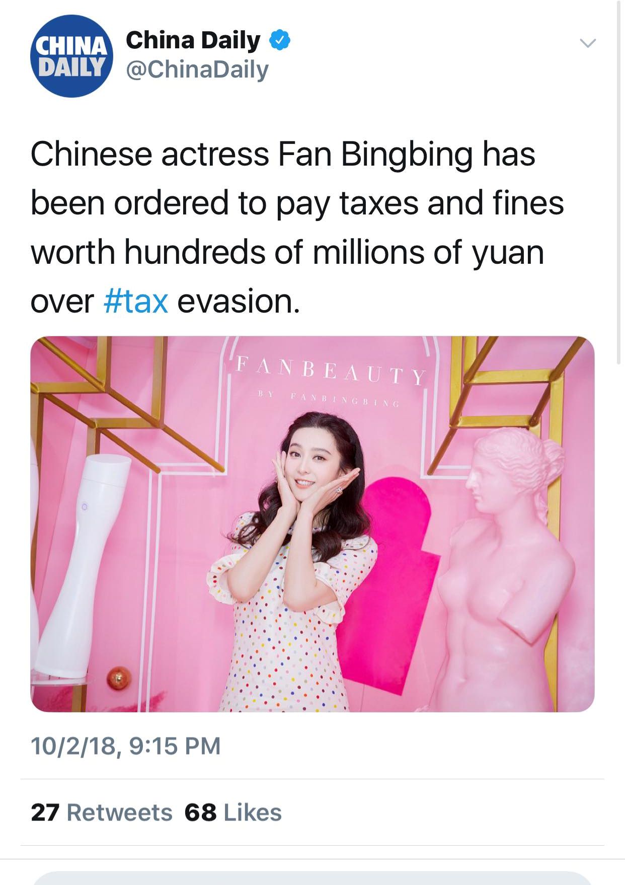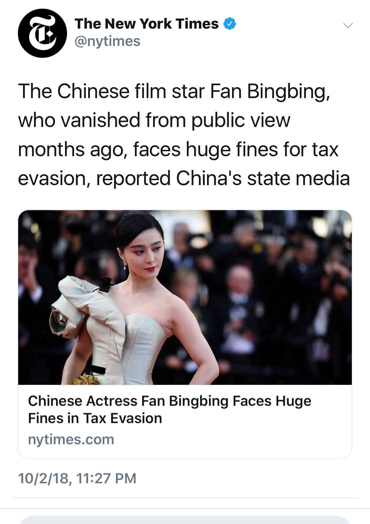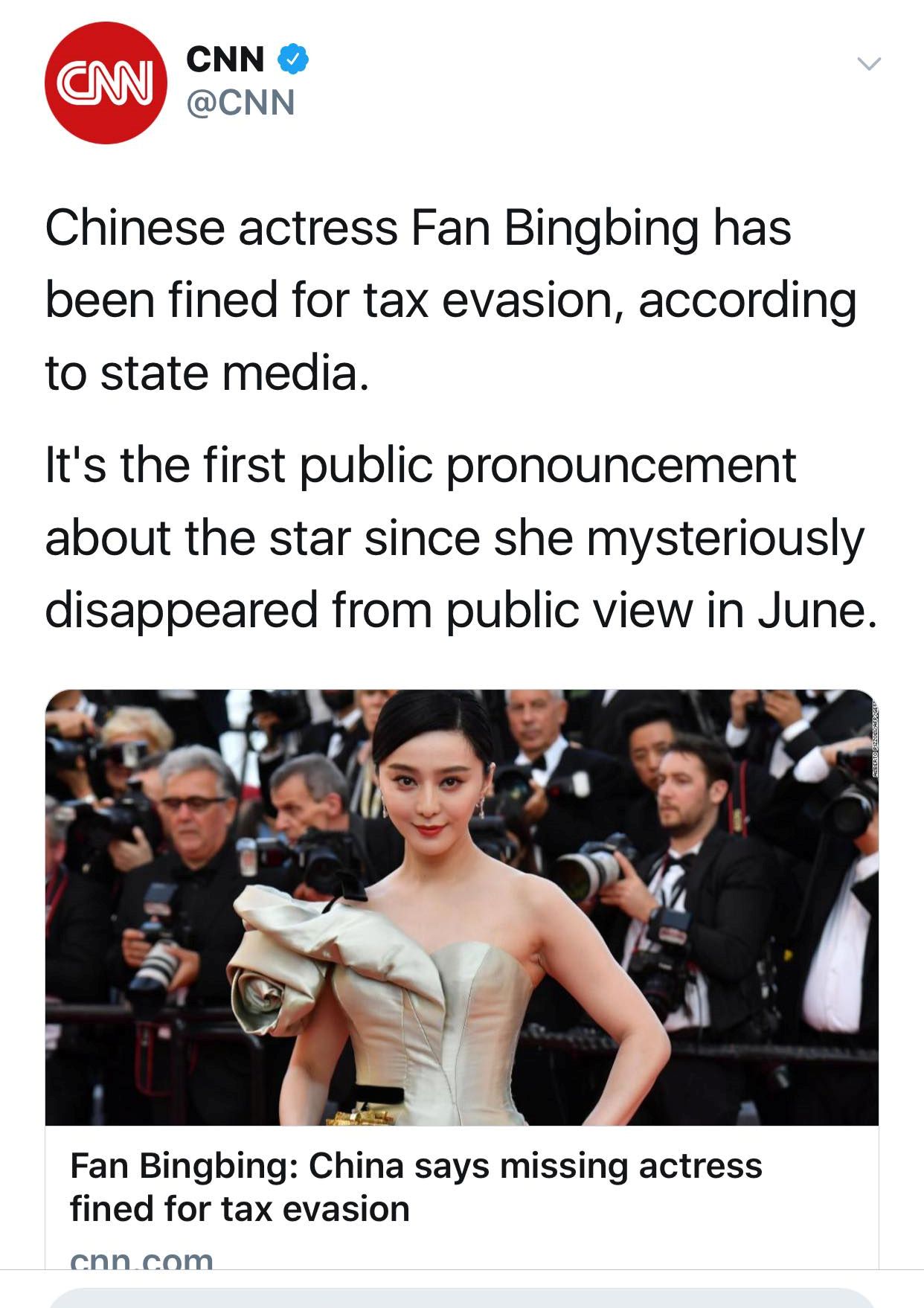 Ngày 03/10, khi CCTV vừa đưa tin thì trên twitter đã nhanh chóng xuất hiện hàng loạt bài báo về việc trốn thuế của Phạm Băng Băng.