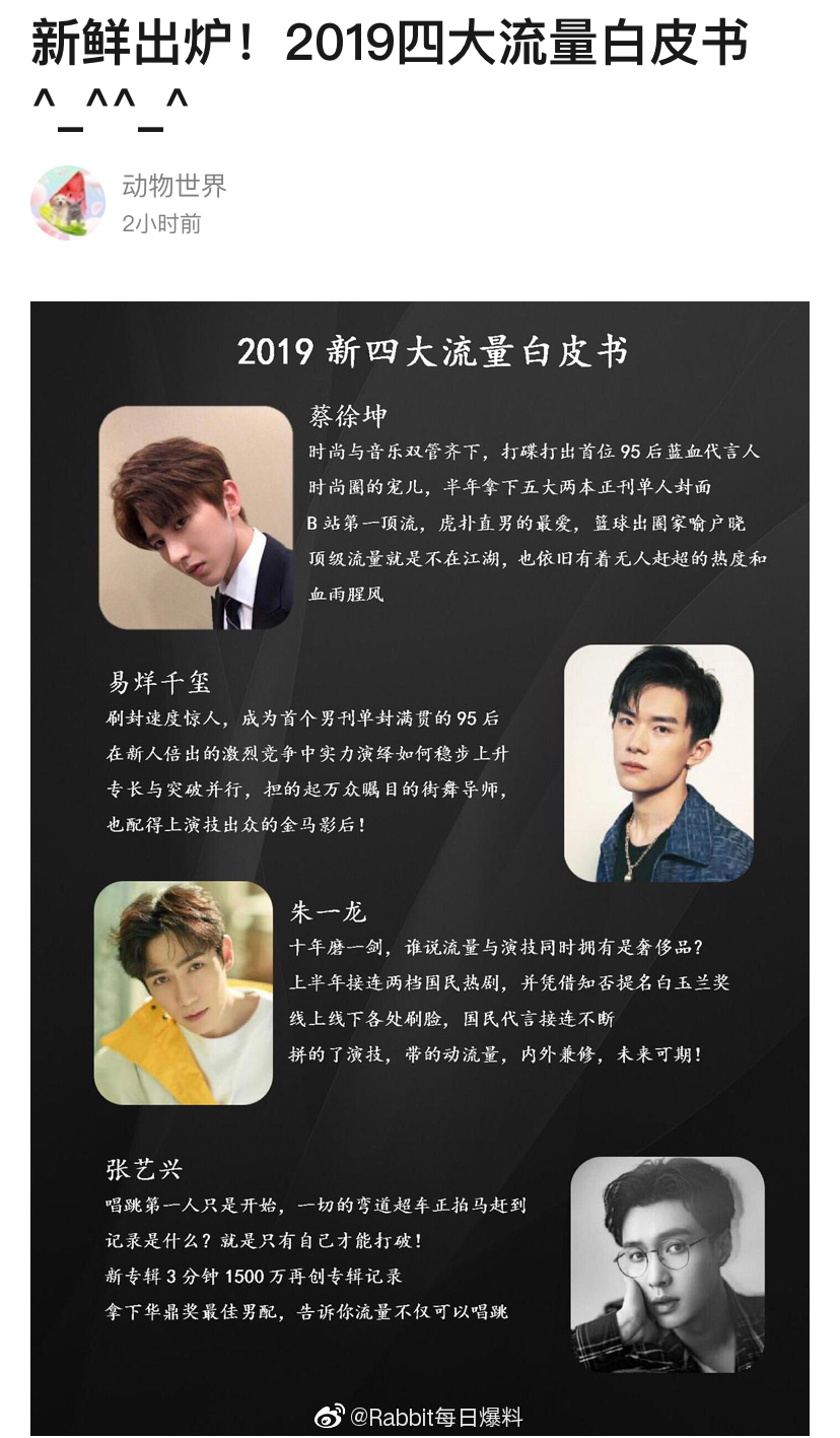 Mới đây, danh sách tứ đại lưu lượng năm 2019 cũng đã được công bố gồm bốn cái tên như Thái Từ Khôn, Dịch Dương Thiên Tỉ, Chu Nhất Long và Trương Nghệ Hưng.