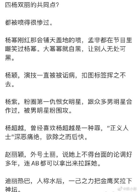 Với đặc điểm chung, tất cả bọn họ đều bị chỉ trích rất thảm. Lúc mới nổi tiếng, Dương Mịch đối mặt với những lời mắng chửi đến nỗi Mạnh Phi cũng từng cười nhạo Dương Mịch. Đại Mịch Mịch phải tự “hắc” chính mình để người khác không còn cơ hội chỉ trích cô nữa. (Hắc có nghĩa là bôi nhọ, mỉa mai, chỉ trích, tạo ra tin đồn xấu,..)