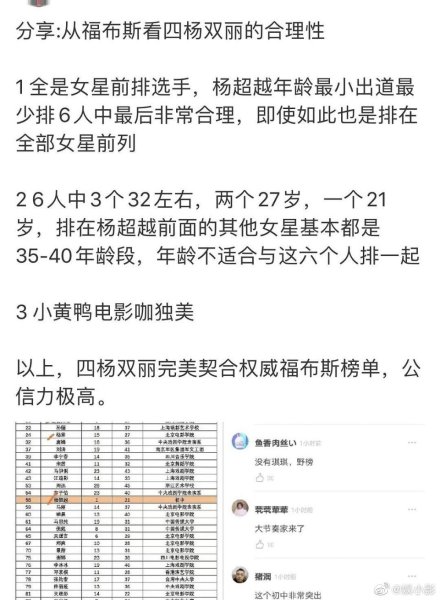 Dựa vào Forbes để xem tính hợp lý của “Tứ Dương Song Lệ”: Thứ nhất, họ đều là những nữ minh tinh hàng đầu. Dương Siêu Việt nhỏ tuổi nhất, ra mắt cũng trễ hơn nên xếp cuối trong danh sách là vô cùng hợp lý. Thứ hai, trong 6 người có 3 người khoảng 32 tuổi, hai người 27 tuổi và một người 21 tuổi. Những nữ minh tinh xếp trước Dương Siêu Việt cơ bản là những người có độ tuổi khoảng 35-40, tuổi tác không thích hợp để xếp chung với dàn còn lại.