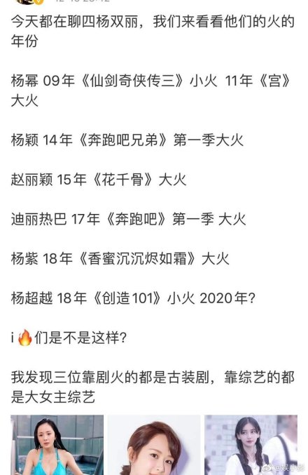 Về phần năm nổi tiếng, Dương Mịch tạo được tiếng tăm khi tham gia Tiên kiếm kỳ hiệp 3 (2009) và trở nên đại bạo với Cung tỏa tâm ngọc (2011). Angelababy tạo nên sức hút trong chương trình Running Brothers/Keep Running.