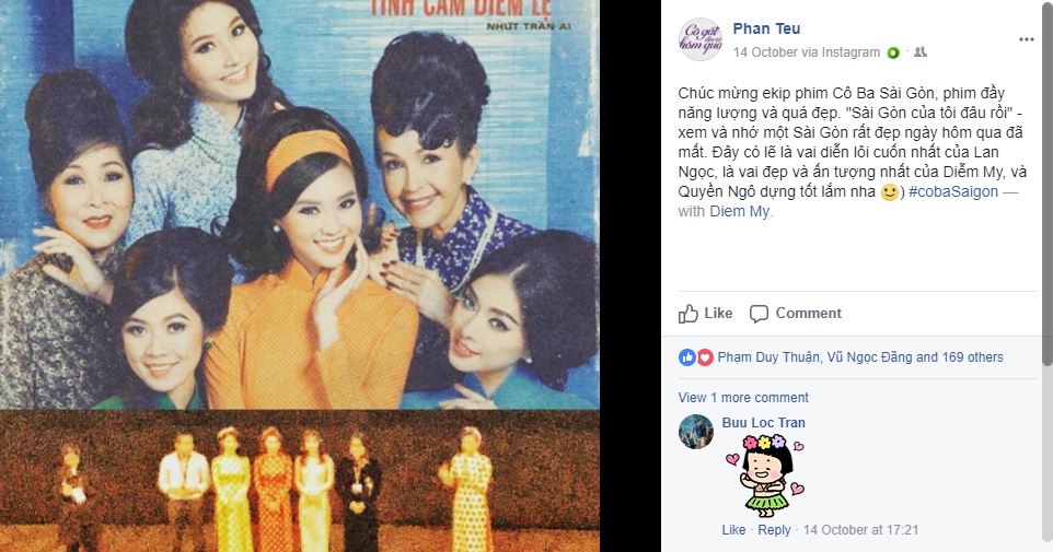 Chúc mừng ekip phim Cô Ba Sài Gòn, phim đầy năng lượng và quá đẹp. “Sài Gòn của tôi đâu rồi” - xem và nhớ một Sài Gòn rất đẹp ngày hôm qua đã mất. Đây có lẽ là vai diễn lôi cuốn nhất của Lan Ngọc, là vai đẹp và ấn tượng nhất của Diễm My, và Quyền Ngô dựng tốt lắm nha.