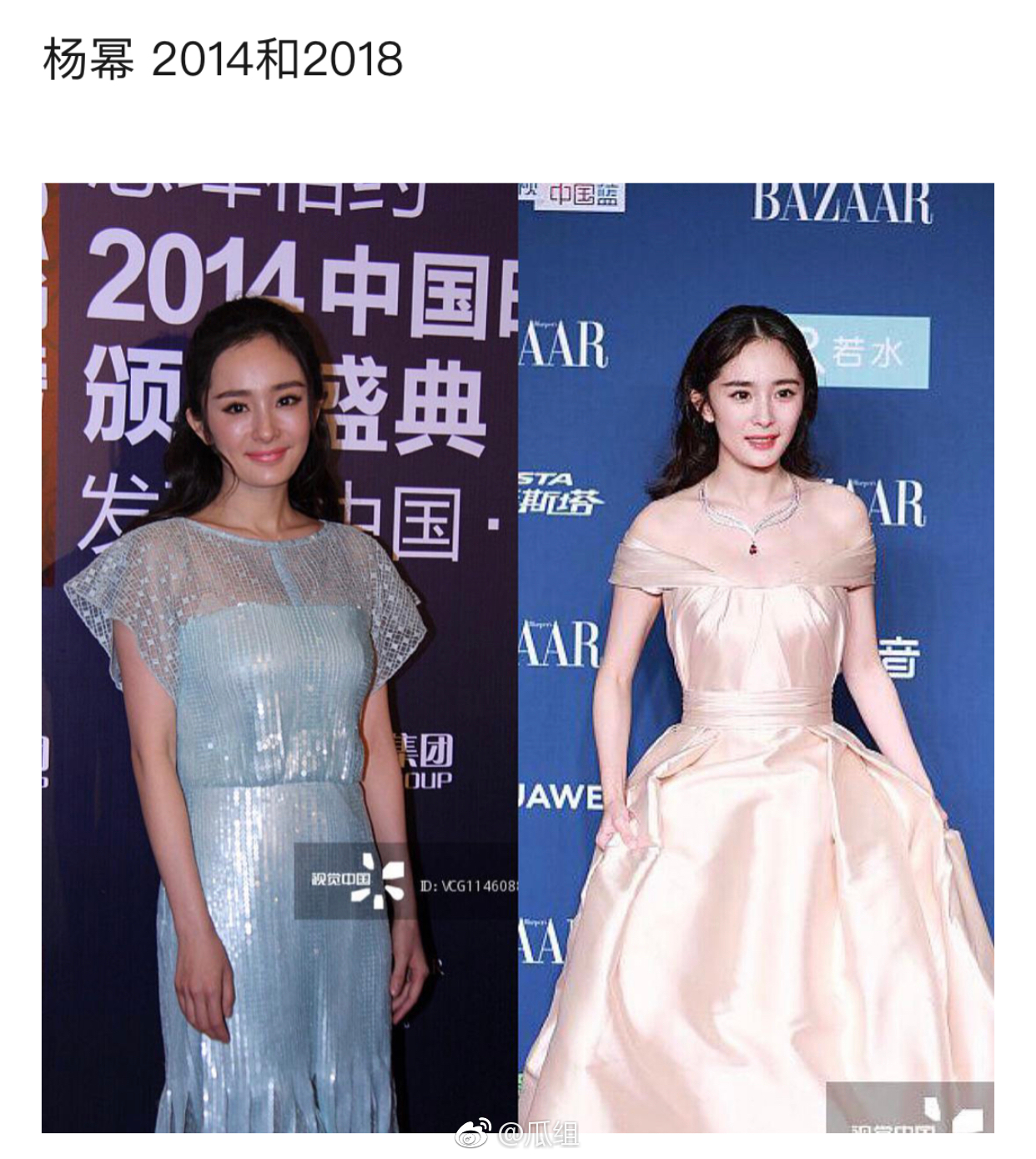 Dương Mịch của năm 2014 là khoảng thời điểm cô vừa sinh con gái Tiểu Nhu Mễ chưa lâu. Khi đó, trông Dương Mịch “có da có thịt” hơn bây giờ nhưng cách makeup nhạt dường như đã “dìm” người đẹp khá nhiều. Sau 4 năm, phong cách thời trang của Dương Mịch cũng có nhiều thay đổi, quyến rũ và không còn “bánh bèo” như trước.