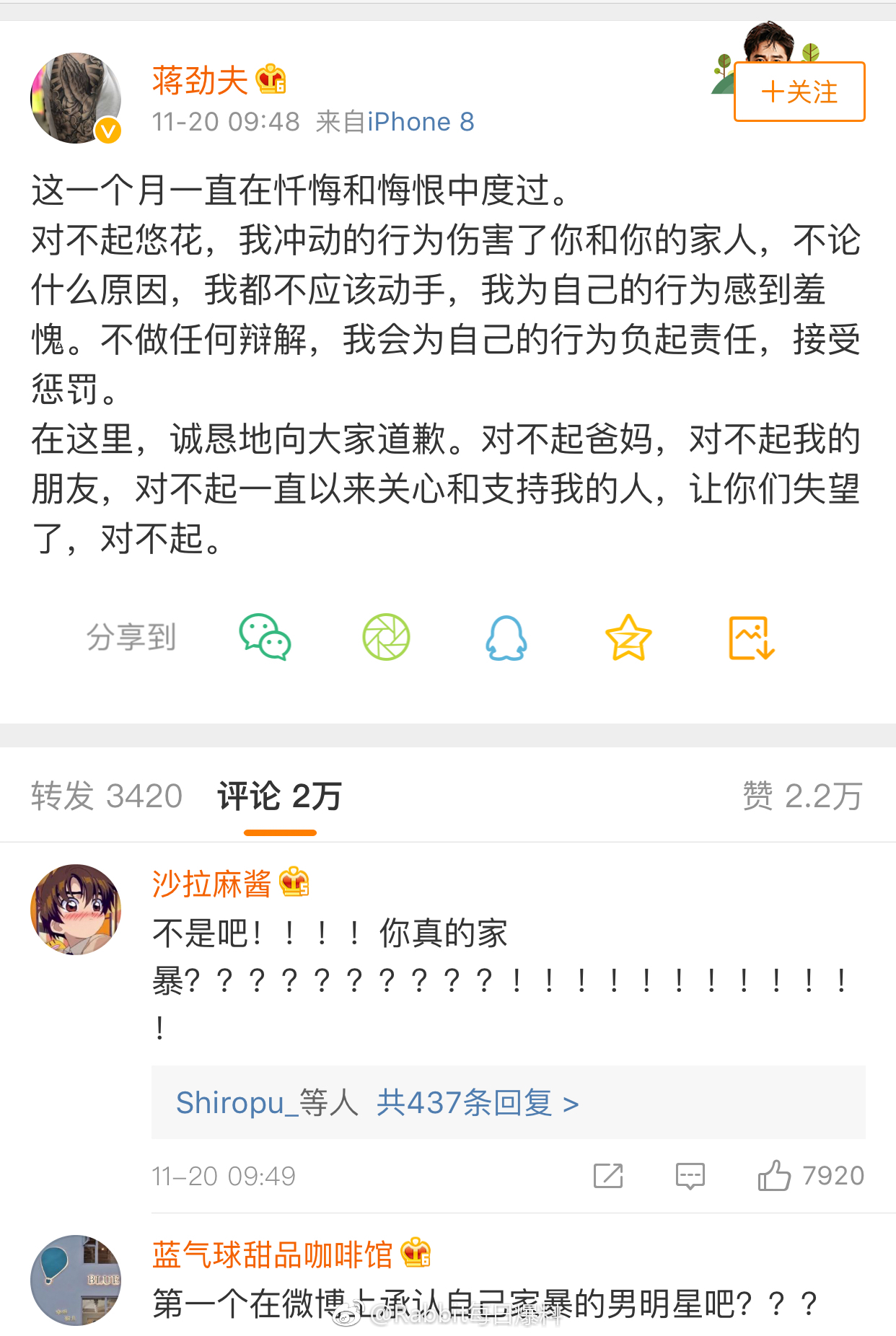 Đối với sự việc này, bên phía Tưởng Kình Phu cũng đã lên tiếng thừa nhận hành vi bạo lực của mình với bài đăng trên weibo: “Một tháng nay tôi đã trải qua kỳ nghỉ trong sự ăn năn và hối hận. Xin lỗi Haruka Nakaura, hành động bồng bột này của anh đã làm tổn hại đến em và người nhà của em. Bất luận là nguyên nhân gì, anh cũng không nên ra tay như thế. Anh cảm thấy hổ thẹn về việc làm của mình, không giải thích bất kỳ điều gì, cũng sẽ chịu trách nhiệm với những gì bản thân đã gây ra, chấp nhận sự trừng phạt. Tại đây, tôi thành thật gởi lời xin lỗi đến mọi người. Xin lỗi ba mẹ, xin lỗi những người bạn của tôi, xin lỗi những người từ trước đến nay luôn ủng hộ và quan tâm tôi. Đã để mọi người thất vọng rồi. Xin lỗi!”.