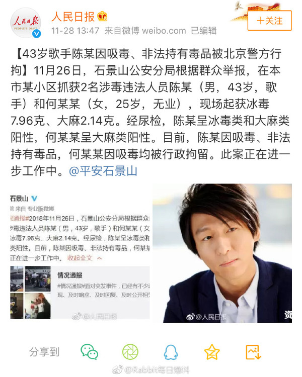 Và rồi trưa ngày hôm đó Nhật Báo Nhân Dân và weibo chính thức của khu vực Thạch Cảnh Sơn đã ra thông báo cho biết: “#Báo cáo tình hình#, Ngày 26 tháng 11 năm 2018, Cục cảnh sát Thạch Cảnh Sơn dựa theo sự khai báo của người dân nơi đây, đã bắt giữ được một người họ Trần (nam, 43 tuổi, ca sĩ) và một người họ Hà (nữ, 25 tuổi, không nghề nghiệp) đang sử dụng ma túy ở một khu xóm nhỏ thuộc khu vực Thạch Cảnh Sơn. Hiện trường thu được 7.96 gram ma túy đá và 2.14 gram cần sa” như một cú tát thẳng vào mặt phòng làm việc. Ngay sau đó, bài viết thanh minh cách đây không lâu của phòng làm việc Trần Vũ Phàm cũng đã không cánh mà bay.