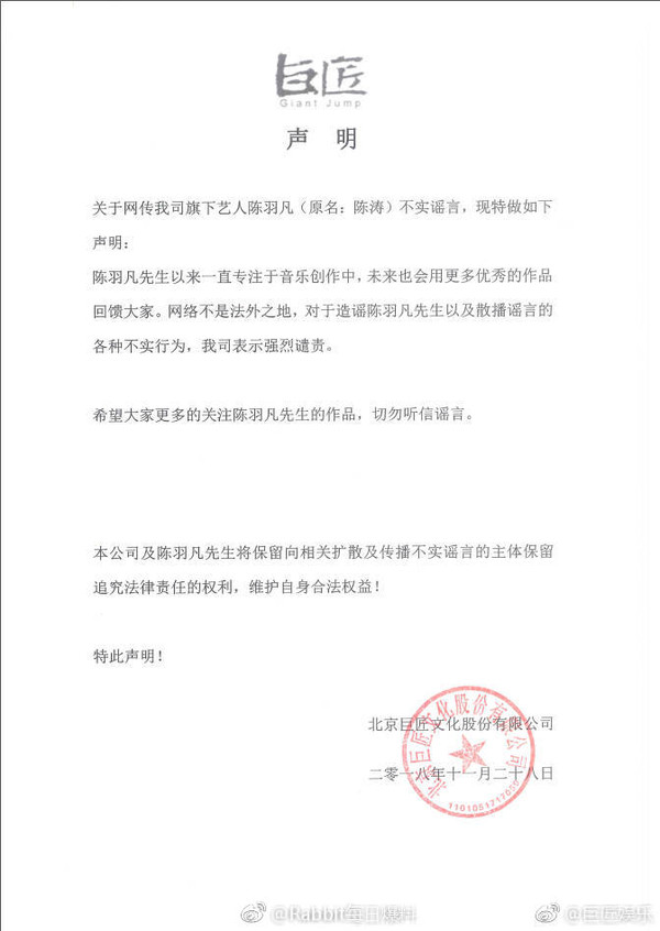 “Trần Vũ Phàm tiên sinh vẫn luôn chuyên tâm cho việc sáng tác nhạc, muốn dùng những tác phẩm ưu tú nhất để mang đến cho mọi người. Đối với nhưng tin đồn bịa đặt liên quan đến Trần Vũ Phàm tiên sinh và những hành vi lan truyền, công ty chúng tôi sẽ lên án đến cùng. Hy vọng mọi người chú ý nhiều hơn đến những tác phẩm của Trần Vũ Phàm tiên sinh, tránh xa những tin đồn thị phi”. Bên cạnh đó, Trần Vũ Phàm cũng đã đăng lên weibo mình như việc báo bình an với bài viết: “One love” chứng minh mình không bị bắt như lời đồn.