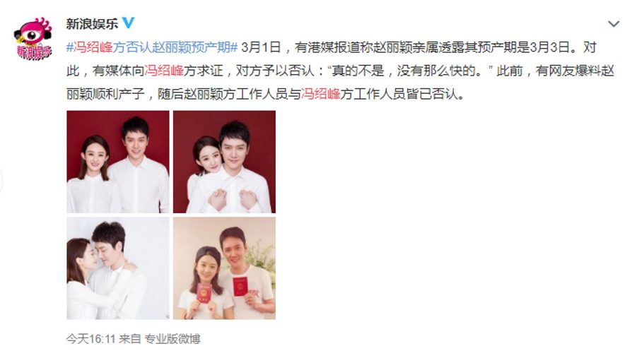 Và mới đây nhất là việc Triệu Lệ Dĩnh sẽ hạ sinh em bé vào ngày nào. Cách đây không lâu các trang mạng trên weibo tiếp tục đưa tin Triệu Lệ Dĩnh sẽ hạ sinh con trai đầu lòng vào ngày 3 tháng 3 năm 2019 nhận được sự quan tâm chú ý của mọi người. Thế nhưng ngay sau đó nhân viên phía Phùng Thiệu Phong lại phủ nhận cho biết: “Không có, làm sao nhanh như vậy chứ“ thế nhưng chỉ năm ngày sau tức là ngày hôm nay (8/3/2019) Triệu Lệ Dĩnh đã thực sự hạ sinh con trai đầu lòng với bài viết xác nhận trên weibo của Phùng Thiệu Phong: “Mẫu tử bình an, hôm nay trong nhà lại có thêm một tiểu nam tử hán cùng nhau bảo vệ cho người mẹ vỹ đại”. Cách 5 ngày thì đã được xem là lâu rồi sao?