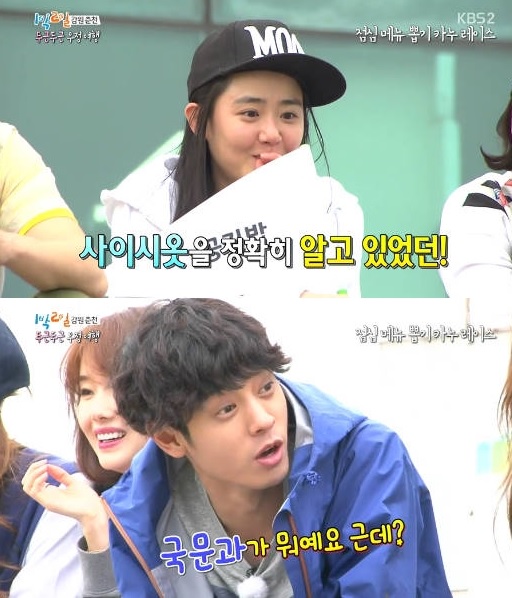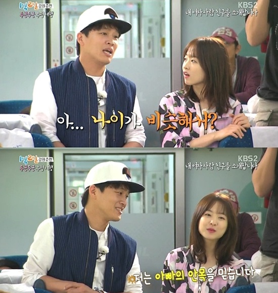 Kim Joo Hyuk tiếp tục: “Ai sẽ là người đến với em ấy'…anh sẽ rất lo lắng nêu như anh là anh trai của em ấy”. Defconn hỏi: “Thế bạn trai như thế nào thì tốt với em ấy?. Hãy chọn một trong tất cả các thành viên của '2 Day & 1 Night' đi”. Cố diễn viên tỏ vẻ hững hờ: “Thành viên của '2 Day & 1 Night' hả. Khó trả lời quá. Em ấy phải gặp gỡ một người thật tuyệt vời. Một người có phong cách giống em ấy. Em ấy thích ở nhà”.