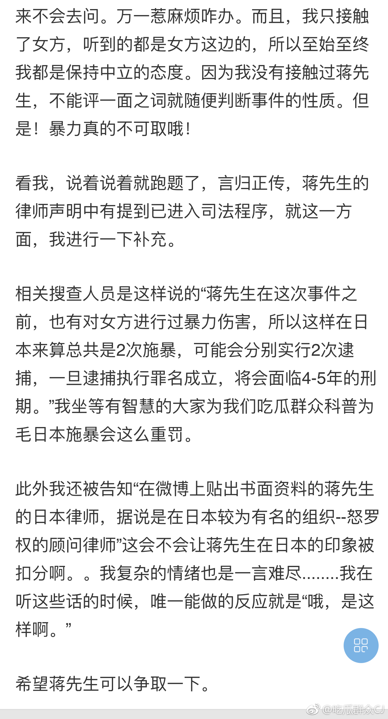 Đồng thời, người này còn cho biết “Trước khi chuyện này xảy ra, Tưởng Kình Phu tiên sinh đã cũng đã từng gây ra tổn thương cho phía nữ, vì vậy tổng kết lại là hai lần bạo lực, có thể sẽ lần lượt tiến hành hai lần bắt giữ. Một khi chấp hành bắt giữ tội danh sẽ được thành lập, có thể đối mặt với 4-5 năm tù”.