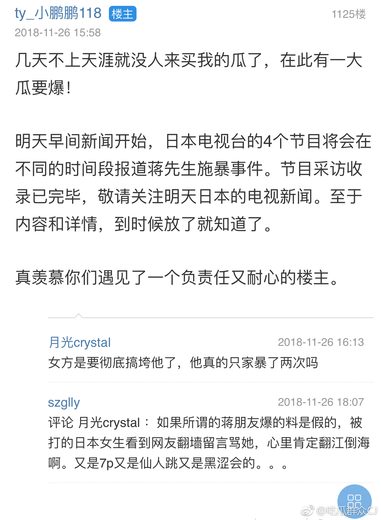 Bài viết này được đăng tải bởi một tài khoản trước đó thông báo Tưởng Kình Phu mất tung tích ở Nhật Bản vào khoảng giữa tháng 10 năm 2018. Tài khoản này cho biết sáng sớm ngày mai (27/11) bốn đài truyền hình Nhật Bản sẽ đưa tin trong chương trình của mình vào những khoảng thời gian khác nhau thông báo Tưởng Kình Phu về những hành vi bao lực lần này. Mọi việc thu hình, phỏng vấn đã hoàn tất, mọi chuyện chờ ngày mai tự ắt sẽ rõ.