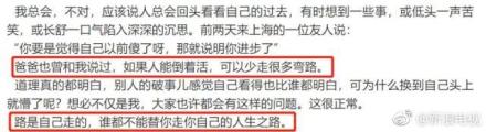 Bên cạnh đó, Tưởng Kình Phu còn viết một bài viết dài viết dài cảm khái về cuộc sống trên WeChat của mình: “Tôi từng nghe ba nói, nếu như con người có thể sống càng ngày càng tốt hơn, nhiều vui vẻ ít phiền não thì có thể bớt đi rất nhiều việc. Đạo lý thật sự đều hiểu nhưng tại sao khi đến bên mình thì bắt đầu ngu muội cơ chứ? Đường là do mình đi, ai cũng không thể thay bạn lựa chọn trên cuộc sống này”….