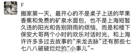 “Ngày đầu tiên chuyển nhà vui vẻ nhất không phải là trên bàn đầy những táo chuối được tặng hay những ổ bánh mì, chai nước suối miễn phí, cũng không phải là những ánh nắng trong thời gian ngắn ngủi và tạm biệt những phiền não trong ngày mưa gió mà chính là thời khắc cùng với hai anh bảo vệ dưới lầu nói chuyện vui vẻ cùng nhau hết hai giờ đồng hồ với những chuyện đã qua ở Thượng Hải, còn có những chuyện nhỏ không mấy tốt đẹp nữa”.