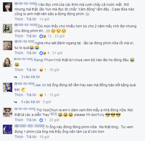 “Yunho đóng phim” đã trở thành từ khóa siêu hot trên các diễn đàn phim ảnh Hàn Quốc vào ngày hôm nay. Bên cạnh những lời động viên mong Yunho cố gắng khẳng định khả năng thì cũng có rất nhiều nhận xét hài hước được khán giả đưa ra như: “Ah xinh anh đừng đóng phim mà…, làm ơn”; “Yunho à… Em thích anh ấy vì anh là người tốt và rất chăm chỉ, nhưng mà diễn xuất của anh thì có hơi… “, “Đạo diễn tốt thì cũng có quyết định được phim hay đâu, còn phải xem kịch bản nữa kìa, mà kịch bản phim này thì khó nhằn quá”; “Oppa à, hãy ra bài hát mới được không”… Rõ ràng khán giả vẫn dành rất nhiều tình cảm cho Yunho sau thời gian dài ở quân ngũ, nhưng ai cũng nhận định rằng phim ảnh có vẻ không phải là lãnh địa phù hợp với anh chàng.