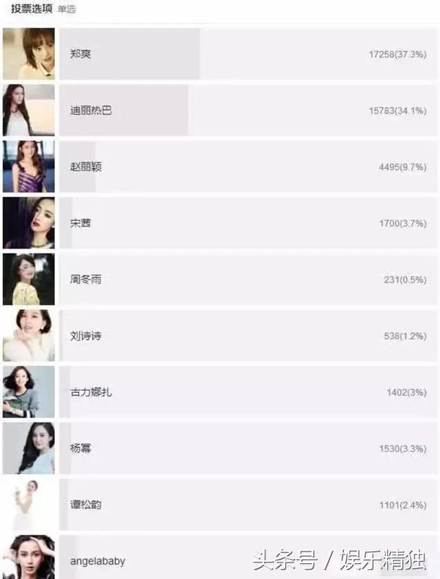 Các nữ diễn viên được bầu chọn có rất nhiều gương mắt sáng giá như Trịnh Sảng, Địch Lệ Nhiệt Ba, Cổ Lực Na Trát, Châu Đông Vũ… Tin chắc rằng, các fan của họ đều đang nỗ lực bỏ phiếu cho thần tượng của riêng mình.