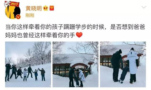 Gia đình của nam diễn viên Huỳnh Hiểu Minh thường bị bắt gặp ở các hoạt động bên ngoài. Anh đưa cả nhà đi trượt tuyết, cũng như đến trường quay và lớp học thêm của bà xã để đón.