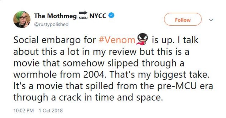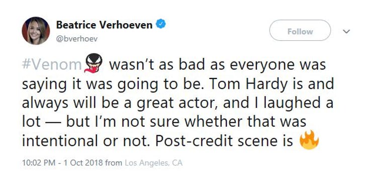 Venom cũng không hẳn tệ như mọi người đồn thổi đâu. Tom Hardy vẫn luôn thể hiện tốt tài diễn xuất của mình, tôi đã cười rất nhiều - nhưng tôi cũng không chắc mấy tình huống hài hước đó là có dụng ý gì hay không. Phần post - credit thật rất hot luôn.