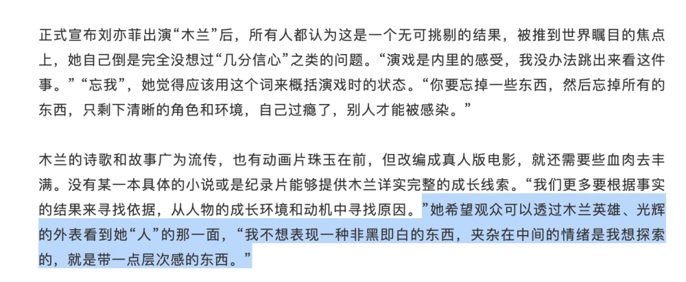 Vậy quan điểm, cảm xúc của Lưu Diệc Phi là gì khi đảm nhận vai diễn Hoa Mộc Lan này? Cô giải thích rằng bản thân mình hy vọng khán giả có thể nhìn thấy những khía cạnh con người khác của Hoa Mộc Lan chứ không chỉ ở phương diện là một nữ anh hùng: “Tôi không muốn thể hiện một thứ gì đó đơn giản không đen thì là trắng. Cảm xúc ở giữa là điều tôi muốn khám phá. Một thứ gì đó đầy lớp lang thú vị“.