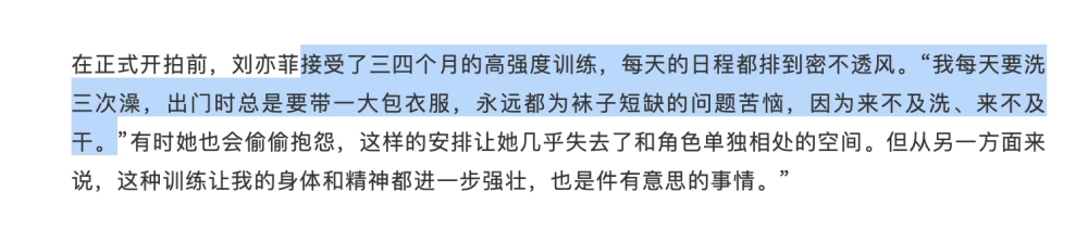 Theo đó, Lưu Diệc Phi sẽ tiến hành trải qua huấn luyện thân thể vào mỗi sáng sớm, cưỡi ngựa vào buổi trưa, võ thuật vào buổi chiều, kế tiếp còn học lời kịch cùng tập luyện. Mặc dù vậy, Lưu Diệc Phi không thấy khó khăn và mệt mỏi: “Trước khi bạn diễn một vai nào đó, bạn luôn ở trạng thái thăm dò. Mỗi ngày đều tìm kiếm những điều mới mẻ, như thế sẽ không cảm thấy mệt mỏi hay rã rời”.