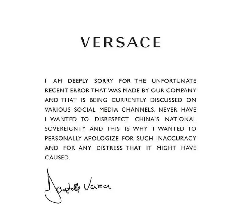 Tháng 8 năm 2019, Versace đã thiết kế một chiếc áo phông, liệt kê tên các quốc gia trên thế giới ở mặt sau chiếc áo này. Nhưng điều đáng nói ở đây, là Versace đã đưa Macau và Hong Kong lên cấp quốc gia. Versace đã liệt kê tên các thành phố và quốc gia bằng tiếng anh, bao gồm Milan - Italy, Boston - USA, nhưng lại có Hong Kong - Hong Kong, Macau - Macau mà không phải China - Trung Quốc.