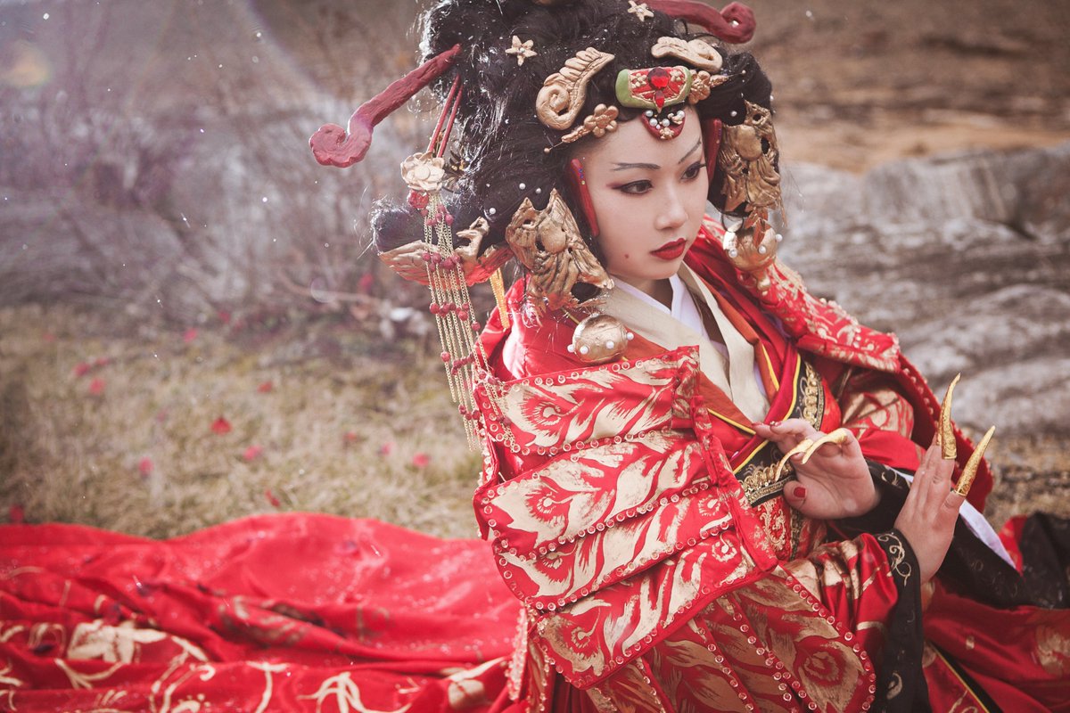 Tới khi xưng đế, Phạm Băng Băng lại chọn cho mình hai gam màu chủ đạo là vàng và đỏ thắm, thể hiện sự uy quyền tôn nghiêm với tầng tầng lớp lớp các trang sức phụ kiện đi kèm.