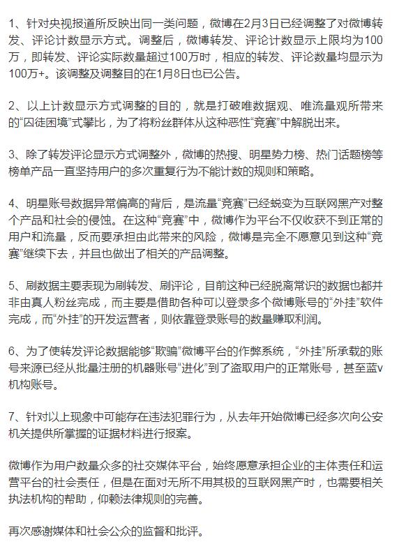 Bên cạnh đó, trong bài viết thanh minh mới của Weibo có ghi, biểu thị cho biết đã tiến hành quan sát những hành vi này, đồng thời vào ngày 3 tháng 2 sớm đã đưa ra lượng giới hạn lượt bình luận chia sẻ là 1 triệu lượt, đồng nghĩa với việc tất cả những lượng tương tác đều ở mức 1 triệu trở xuống mà thôi.