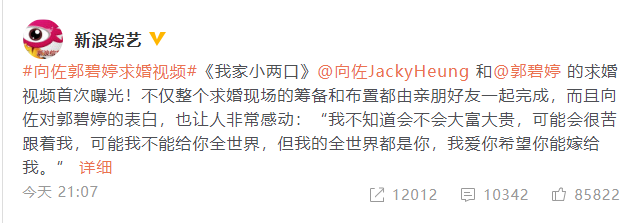 Tối ngày 6/7, trong chương trình tống nghệ Mr & Mrs (我家小两口), đoạn Hướng Tả cầu hôn Quách Bích Đình đã được công khai. Hướng Tả đã ngọt ngào bày tỏ: “Anh không biết sẽ giàu sang, phú quý hay không, có thể theo anh, em sẽ rất khổ cực, có thể anh không cho em được cả thế giới nhưng cả thế giới của anh đều là em, anh hi vọng em có thể gả cho anh”.