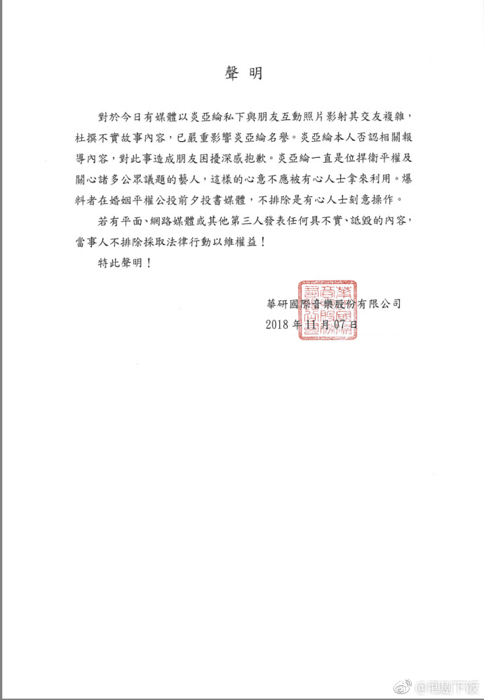 “Đối với các tin tức được lan truyền trên phương tiện truyền thông hôm nay, Viêm Á Luân đã đích thân giải thích với bạn bè của mình. Thông tin sai lệch của câu chuyện đã ảnh hưởng nghiêm trọng đến danh tiếng của Viêm Á Luân. Chính Viêm Á Luân đã phủ nhận những nội dung liên quan và vô cùng xin lỗi vì những rắc rối đối với bạn bè của anh. Anh ấy luôn là một nghệ sĩ bảo vệ quyền lợi và quan tâm đến nhiều vấn đề cộng đồng. Thông tin trái sự thật này được đưa ra trước cuộc trưng cầu dân ý về hôn nhân gia đình, cho nên không thể loại trừ đây là hành vi cố ý gây nhiễu loạn. Nếu có bất kỳ phương tiện truyền thông nào cố tình đưa ra thông tin sai lệch, phỉ báng, không đúng sự thật thì chúng tôi sẽ có hành động pháp lý để bảo vệ quyền lợi của Viêm Á Luân”.