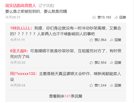 Ngoài ra còn rất rất nhiều bình luận khác nhau. Hiện tại bên ký giả vẫn chưa liên lạc được với bên Trương Vũ Kỳ để xác minh thông tin, vì thế tất cả đều vẫn đang nằm trong vùng nghi vấn. Nhưng dù sao chuyện vợ chồng xô xát rồi lại làm hòa thì cũng chẳng có gì khó hiểu. Vấn đều chỉ là đối với mỗi nguồn thông tin, khán giả vẫn rất mông lung không biết đâu là thật đâu là giả. Đến chuyện ly hôn còn không ai biết đã ly hôn chưa thì chuyện tái hợp, hòa giải hay cái gì cũng có thể.