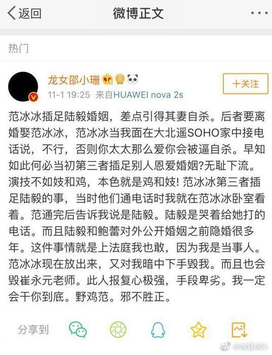 Tối ngày 1/11, Thiệu Tiểu San - nữ diễn viên được biết đến từng là thế thân những cảnh nóng cho Chương Tử Di trong phim điện ảnh Dạ Yến đăng bài tố giác Phạm Băng Băng từng khiến vợ của Lục Nghị - nữ diễn viên Bảo Lôi muốn tự sát vì chồng ngoại tình, muốn ly hôn để đến với Phạm Băng Băng. Bài đăng này còn kể thêm Lục Nghị đã gọi điện cho Phạm Băng Băng khóc lóc mong Phạm Băng Băng chờ đợi để đến với cô. Thế nhưng, hiện tại tài khoản lẫn những bài đăng này đã xóa trên Weibo.