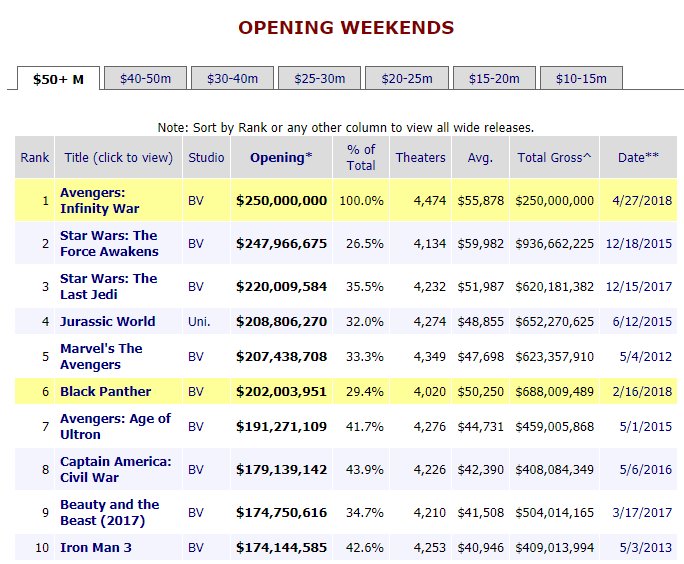 Bộ phim mới nhất của hãng Disney và Marvel - Avengers: Infinity War đã chính thức phá vỡ kỷ lục phòng vé nội địa Bắc Mỹ và toàn cầu, khi trở thành bộ phim có doanh thu mở màn cao nhất mọi thời đại. Tính đến ngày 29/04/2018, sau 3 ngày công chiếu (và suất chiếu sớm tối thứ Năm), Avengers 3 đã thu được 250 triệu USD tiền vé tại Bắc Mỹ. Trong khi đó, nếu thị trường toàn thế giới kể từ ngày 25/04 (một số quốc gia chiếu sớm như Hàn Quốc, Việt Nam…), phim đã đạt 630 triệu USD. Không những vậy, cơn sốt của các siêu anh hùng còn giúp nâng đỡ Black Panther đang ở vị trí thứ 8 trong bảng xếp doanh thu phòng vé cuối tuần trước lên vị trí số 5, và đây quả thực là 1 tuần của nhà Marvel.