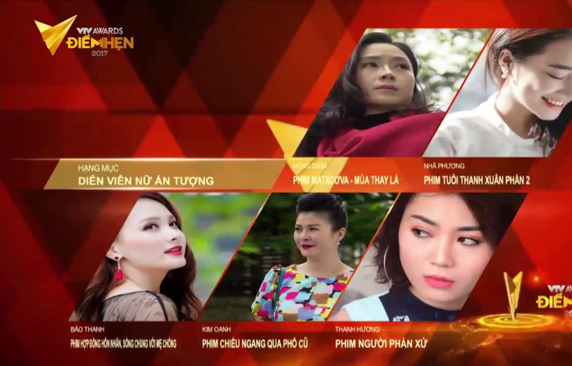 Ở hạng mục dành cho Nữ diễn viên ấn tượng, 5 đề cử thuộc về những gương mặt quen thuộc với khán giả truyền hình trong suốt năm 2017: “Người tình của Junsu” Nhã Phương (Tuổi thanh xuân 2), cô con dâu xinh đẹp Bảo Thanh (Sống chung với mẹ chồng) cùng ba nữ diễn viên Thanh Hương, Hồng Diễm, Kim Oanh.