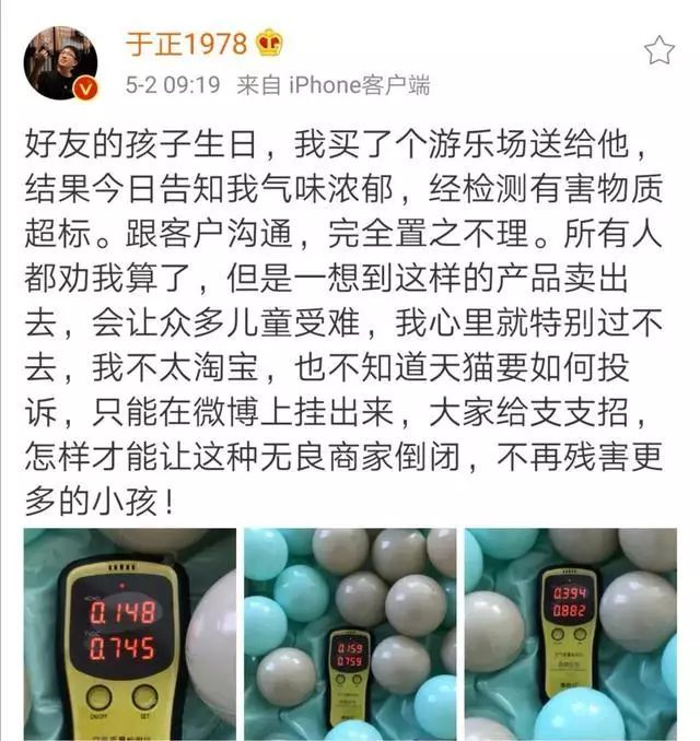 Mới đây, nhà chế tác phim truyền hình nổi tiếng Vu chính đã gặp phải chuyện xui xẻo như thế này. Từ trong bài viết mà Vu Chính vừa đăng cách đây không lâu, không khó để nhìn thấy những chuyện vừa mới xảy ra. Hóa ra, ngày 1 tháng 5 Vu Chính đã mua một trò chơi nội thất làm quà tặng cho con của một người bạn và phải tốn hơn 2 ngàn NDT để có nó. Một tấm lòng tốt kết quả lại mang đến rắc rối. Sau khi mua về nhà, bày trí đâu vào đó lại phát hiện ra mùi không khí rất khó ngửi, nghi ngờ chất lượng không đạt tiêu chuẩn, phát hiện lượng Formaldehyd đã vượt qua tiêu chuẩn và chính vì vậy đừng nói cho trẻ con chơi, đến người lớn ngửi cũng cảm thấy khó chịu.
