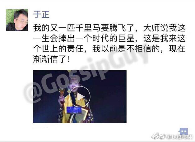Sau khi Ngô Cẩn Ngôn đạt được giải thưởng đã xuất hiện tấm hình Vu Chính đăng trong vòng bạn bè với bài viết: “Thiên lý mã của tôi sắp bay lên rồi, đại sư nói cả đời này của tôi sẽ phò trợ cho một ngôi sao lớn của thời đại. Đây là trách nhiệm để tôi đến với thế gian này. Lúc trước tôi cũng không tin lắm, nhưng bây giờ thì dần dần tin rồi” kèm theo là đoạn video lúc Ngô Cẩn Ngôn nhận giải.