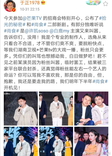 Hôm qua (31.10), một lần nữa Vu Chính công khai chỉ trích một bộ phận cư dân mạng, lên tiếng trả lời về tin đồn Hứa Khải và Bạch Lộc hợp tác được lan truyền bấy lâu nay. Vu Chính xác nhận Hứa Khải và Bạch Lộc sẽ tham gia vào Thượng thực, rất nhiều fan tỏ ra bất mãn với việc này. Hơn nữa, giữa Bạch Lộc và Hứa Khải còn xảy ra tin đồn tình cảm khiến “fan only” hai bên không hài lòng, cảm thấy đối phương không xứng với thần tượng của mình, dẫn đến gây chiến lẫn nhau.