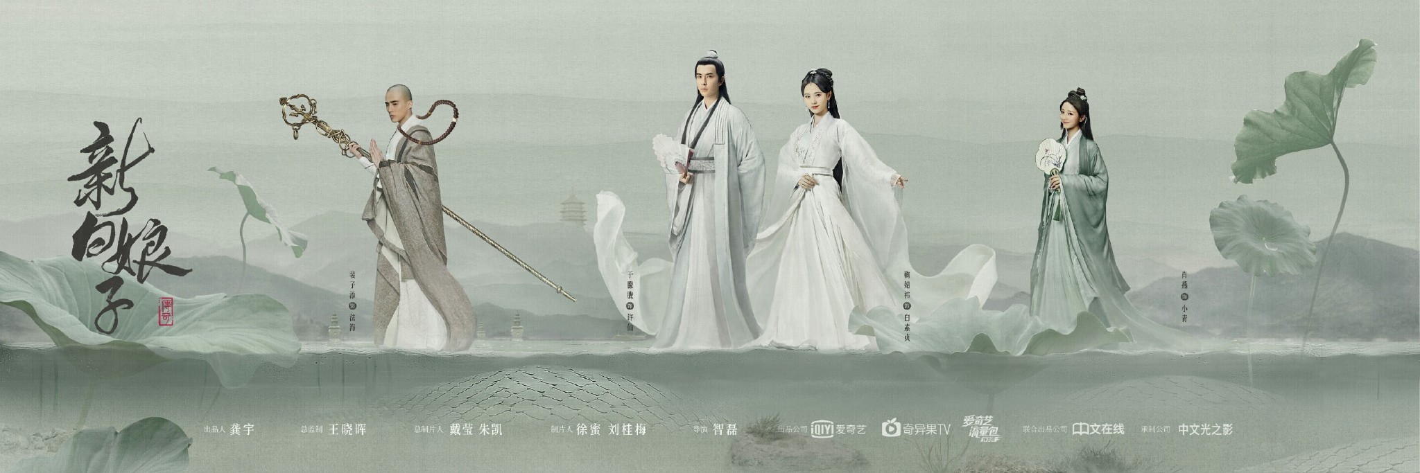 Poster chính thức của “Tân Bạch Nương Tử truyền kỳ” bao gồm Cúc Tịnh Y vai Bạch Tố Trinh/Bạch xà; Vu Mông Lung vai Hứa Tiên; Tiếu Yêu vai Tiểu Thanh/ Thanh xà; Bùi Tử Thiêm vai Pháp Hải.