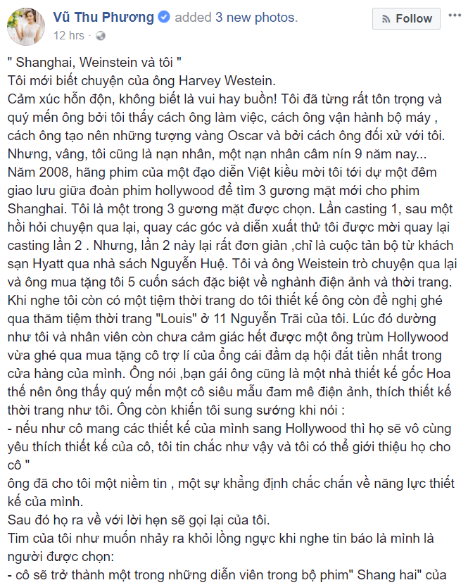 Câu chuyện đằng sau sự xuất hiện chớp nhoáng của mình ở Shanghai và lời tố cáo Harvey Weinstein từng mời đến khách sạn “họp đêm” và “dạy cách đóng cảnh nóng” là lời cảnh tỉnh từ Vũ Thu Phương với những cô gái đang ôm giấc mơ Hollywood phù phiếm. Cô nói: “Tối nay tôi đọc bài báo về ông Harvey và mọi thứ lại cồn cào trỗi dậy như mới xảy ra ngày hôm qua. Tôi nghĩ mình không thể im lặng nữa, đến lúc tôi phải giải thoát cho bản thân mình. Đến lúc tôi đã có thể giải thích được lí do của “bom xịt” Shanghai và lí do tôi từ bỏ giấc mơ Mỹ và hợp đồng với Weistein Film”.
