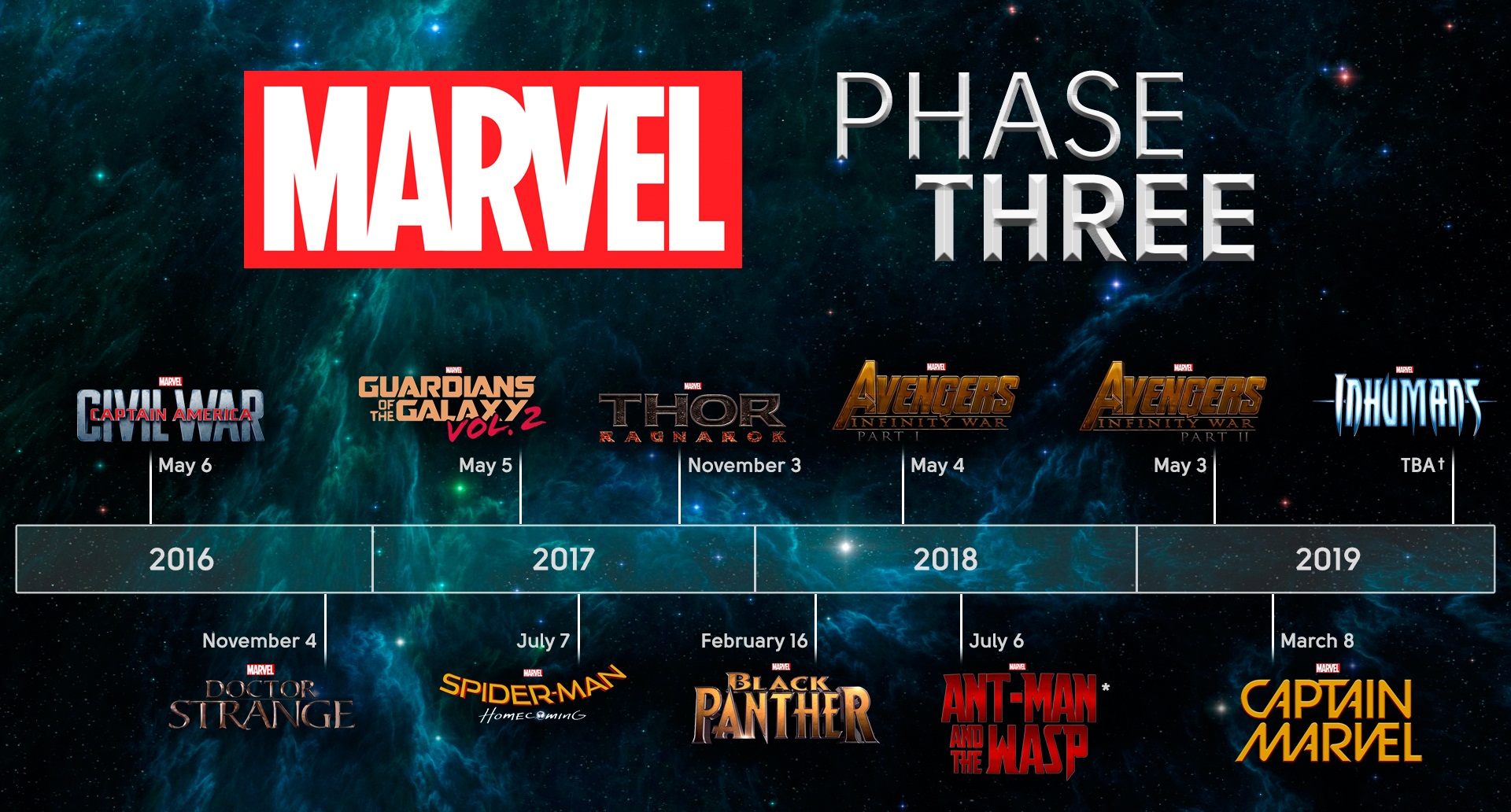 Vào năm 2014, Marvel Studios đã khiến cộng đồng fan của mình bùng nổ khi tổ chức sự kiện công bố các dự án phim thuộc Phase 3 sẽ lần lượt ra mắt. Dĩ nhiên có một vài thay đổi đã xảy ra, nhưng nhìn chung các fan đều được cung cấp một lịch trình tương đối cụ thể và rõ ràng về những sản phẩm điện ảnh nào sẽ ra rạp vào ngày mấy.