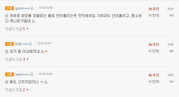 8. [+28, -5] Tôi không biết liệu có phải là do quai hàm của Suzy hay bởi vì xương của cô ấy to. Tuy nhiên, cô ấy trông giống một người đàn ông nếu không trang điểm. Nếu Suzy thực sự lộng lẫy như những gì người hâm mộ của cô ta muốn tin thì tại sao lại chưa quay một thương hiệu hạng sang? Cô ta chỉ chụp ảnh, quay phim với các nhãn hiệu cửa hàng đường phố ㅋ ㅋㅋㅋ ㅋㅋㅋ ㅋㅋㅋ.