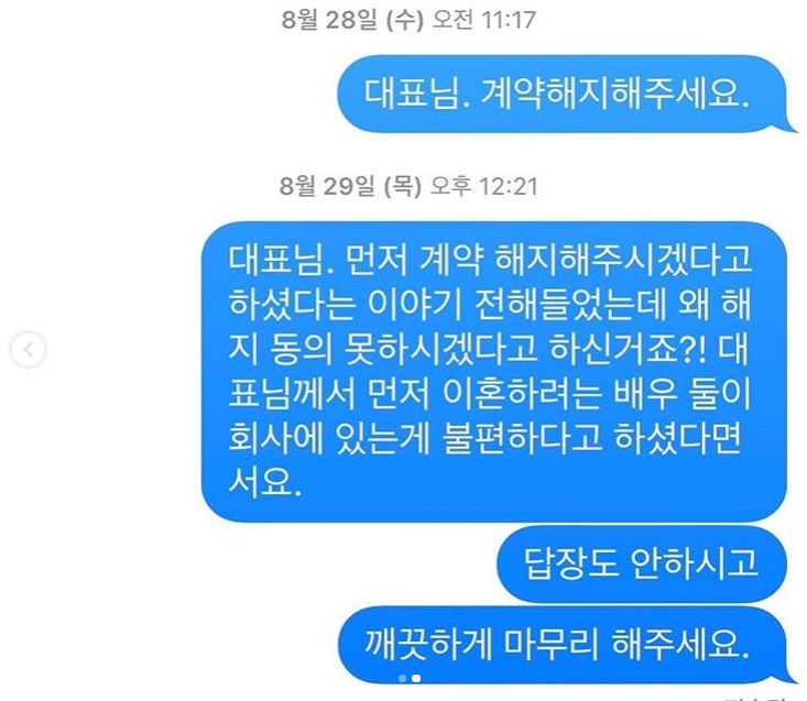 Trong hai bức ảnh chụp màn hình tin nhắn, cho thấy phía giám đốc công ty vẫn chưa phản hồi. Tin đầu tiên, Goo Hye Sun gửi vào ngày 18/08/2019 với nội dung: “Giám đốc, xin chào chị. Tôi không nghĩ mình và Ahn Jae Hyun có thể ở lại cùng một công ty trong tình hình hiện tại. Giám đốc, chị đã nói với tôi rằng sẽ đồng ý chấm dứt hợp đồng.
