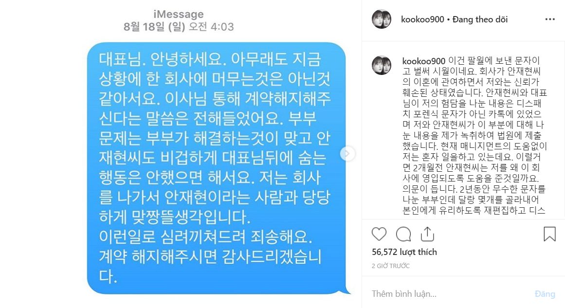 “Nàng cỏ” công khai đoạn tin nhắn gửi giám đốc bắt đầu vào ngày 18/08, ngay sau khi tin tức về việc cô ly hôn với Ahn Jae Hyun được tiết lộ với công chúng, kèm theo chú thích: “Tin nhắn được gửi vào tháng Tám, và bây giờ đã là tháng Mười rồi. Những liên quan của công ty quản lý trong vụ ly hôn với Ahn Jae Hyun khiến tôi thực sự mất hết lòng tin của mình.